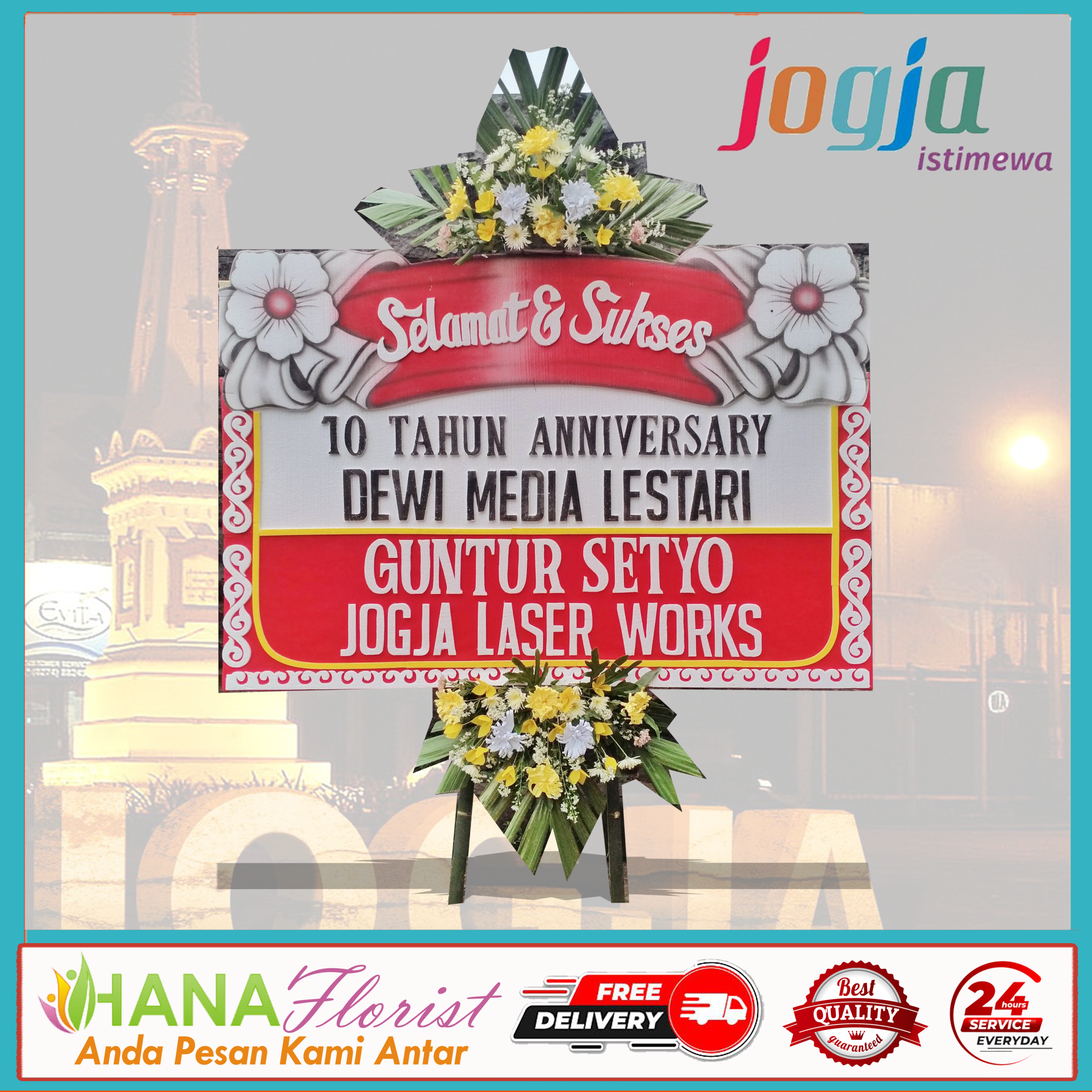 Untuk warna dan model kami bisa menyesuaikan dengan permintaan customer dan sesuai dengan acara. hanaflorist juga melayani pemesanan karangan untuk pengiriman wilayah Propinsi D I Yogyakarta,Kotamadya Yogyakarta,Kabupaten Sleman,Kabupaten Gunung Kidul,Kabupaten Kulon Progo,Kabupaten Bantul.dan juga melayani pemesanan ke luar kota atau lebih tepatnya seluruh indonesia. karena sudah memiliki rekan di seluruh indonesia. dengan harga terjangkau anda sudah bisa melakukan pemesanan dan pengiriman sampai lokasi tanpa biaya tambahan. dalam pengerjaan minimal 2 jam dikarenakan pembuatan sangat diutamakan kualitas. dibuat dengan bahan berkualitas. fresh dan rapi. pengiriman dilakukan oleh driver dari hanaflorist yang sudah terlatih, cekatan, dan ontime, sehingga meminimalisir angka kekecewaan untuk customer. nanti anda akan mendapat foto setelah pengerjaan dan foto beserta video setelah bunga sampai lokasi,guna untuk memberi bukti bahwa bunga sudah sampai lokasi.Untuk pembayaran hana florist memberikan solusi dengan proses administrasi setelah bunga sampai lokasi, jadi setelah bunga sampai lokasi silahkan anda untuk melakukan administrasi melalui rekening yang sudah diberikan oleh hana florist.. anda pesan kami antar sampai tujuan tanpa harus anda yang bawa sendiri.mudah sekali bukan…..mohon maaf sebesar besarnya sekian narasi dari kami, kami tunggu chekout dari anda. terima kasih !
