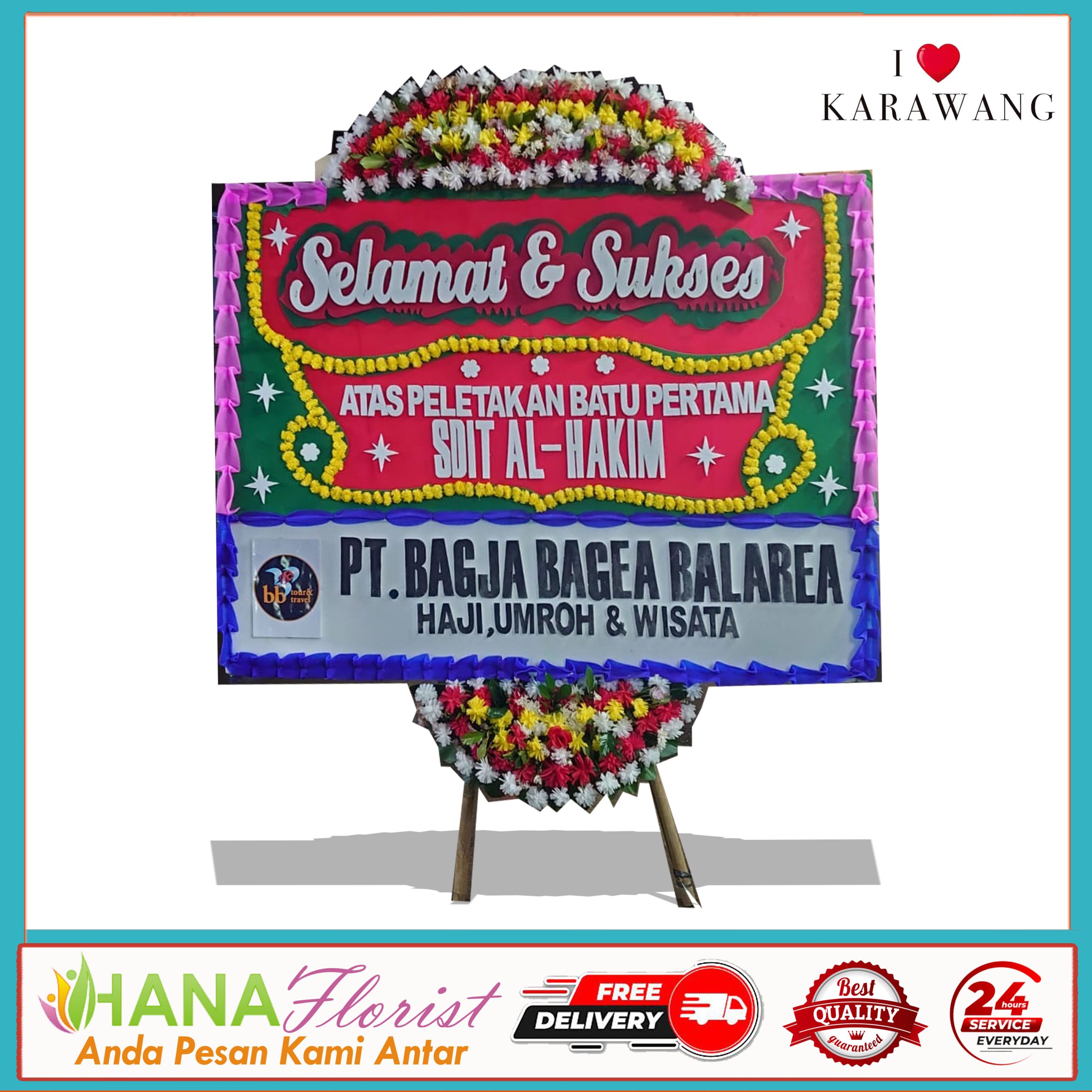 Untuk warna dan model kami bisa menyesuaikan dengan permintaan customer dan sesuai dengan acara. hanaflorist juga melayani pemesanan karangan untuk pengiriman wilayah karawang barat kota timur,klari,dawuan dan juga melayani pemesanan ke luar kota atau lebih tepatnya seluruh indonesia. karena sudah memiliki rekan di seluruh indonesia. dengan harga terjangkau anda sudah bisa melakukan pemesanan dan pengiriman sampai lokasi tanpa biaya tambahan. dalam pengerjaan minimal 2 jam dikarenakan pembuatan sangat diutamakan kualitas. dibuat dengan bahan berkualitas. fresh dan rapi. pengiriman dilakukan oleh driver dari hanaflorist yang sudah terlatih, cekatan, dan ontime, sehingga meminimalisir angka kekecewaan untuk customer. nanti anda akan mendapat foto setelah pengerjaan dan foto beserta video setelah bunga sampai lokasi,guna untuk memberi bukti bahwa bunga sudah sampai lokasi.Untuk pembayaran hana florist memberikan solusi dengan proses administrasi setelah bunga sampai lokasi, jadi setelah bunga sampai lokasi silahkan anda untuk melakukan administrasi melalui rekening yang sudah diberikan oleh hana florist.