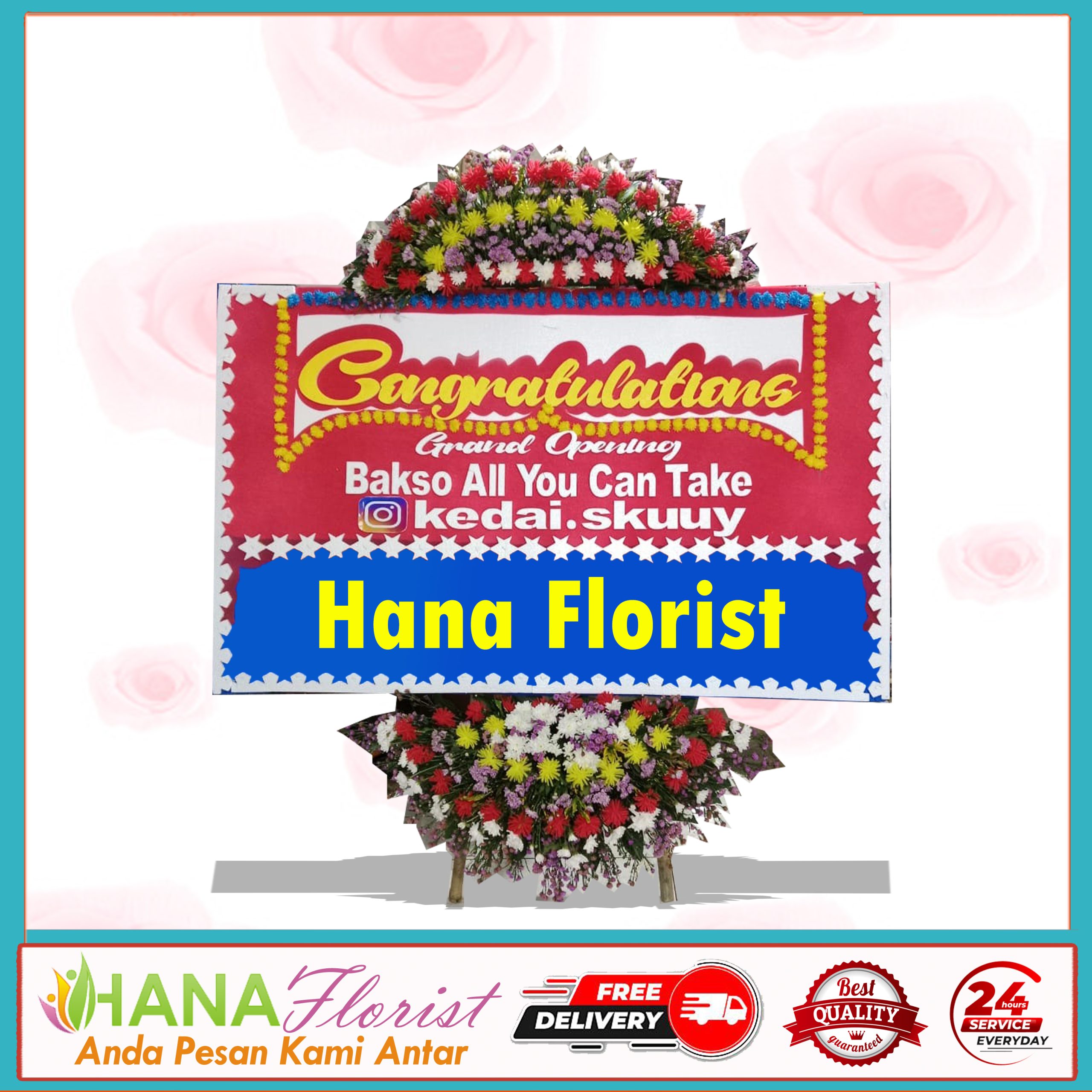 hana florist juga hadir di FB. dan juga hadir di beberapa marketplace.Dengan konsep memudahkan customer untuk memesan tanpa harus datang ke toko,sangan mudah bukan?. Ada beberapa ukuran karangan bunga papan selamat mulai dari.
